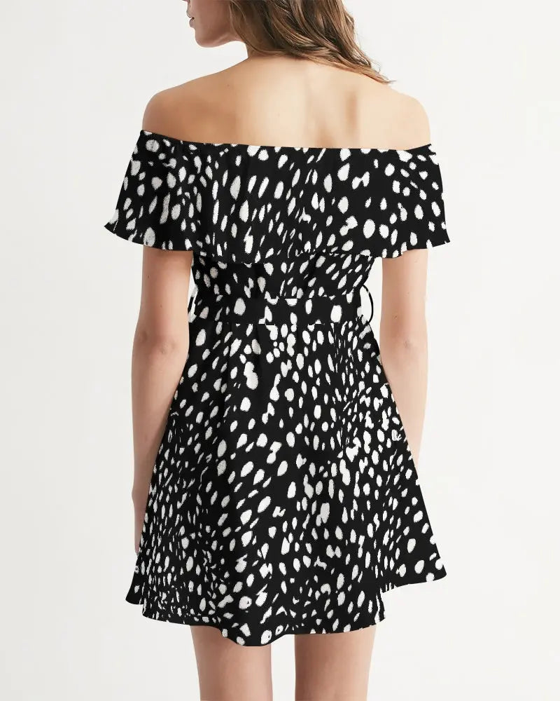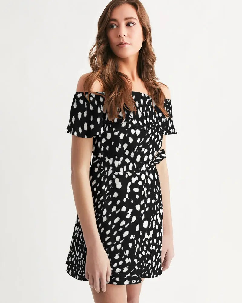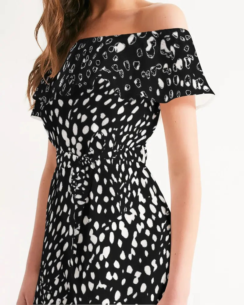 Abito donna blackDettagli del prodotto Con una splendida scollatura arruffata, sembrerai senza sforzo nel nostro vestito da donna con spalle scoperte. Lo chiffon trasparente è decorato con dettagli smock, un orlo arruffato e completato da un dettaglio con cintura regolabile in vita. Tessuto leggero e fluido Corpo rilassato, vita definita